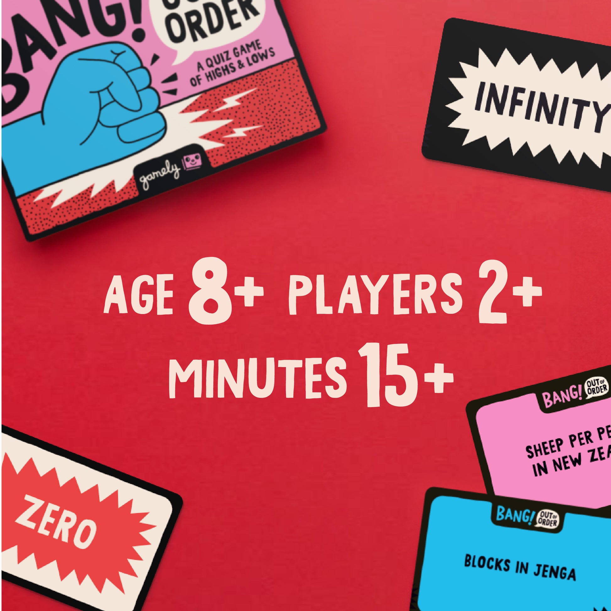 In Bang! Out of Order you don’t really need to know the answers… just decide what's higher or lower and line them up. It’s easy at the start; but as the facts stack up so does the tension!