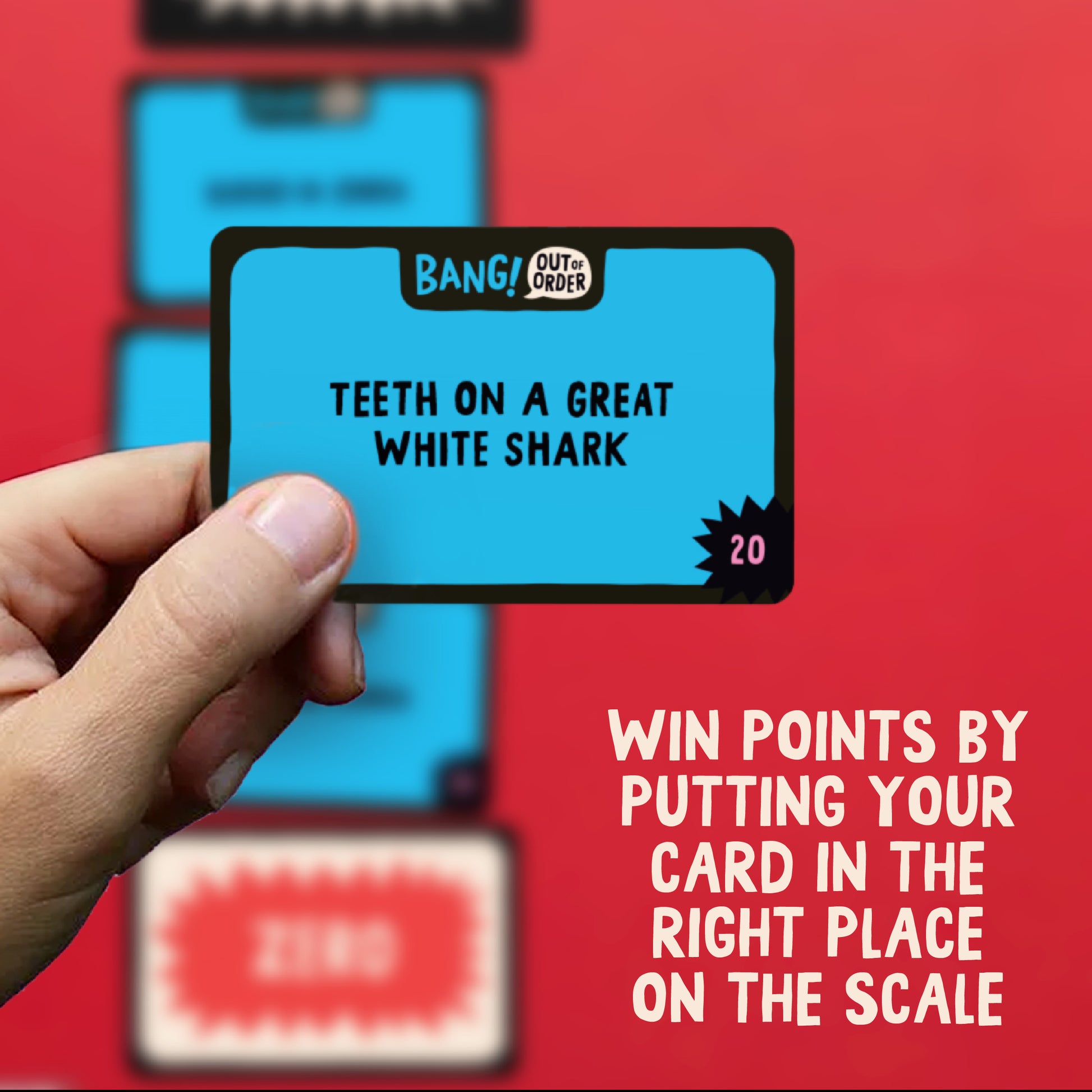 Teams take turns adding cards to the scale - hopefully in the correct order! As the chain builds, so do the chances of it all being wrong. When you think the order has gone awry, slam your fist down on the table and shout “Bang! Out Of Order”.