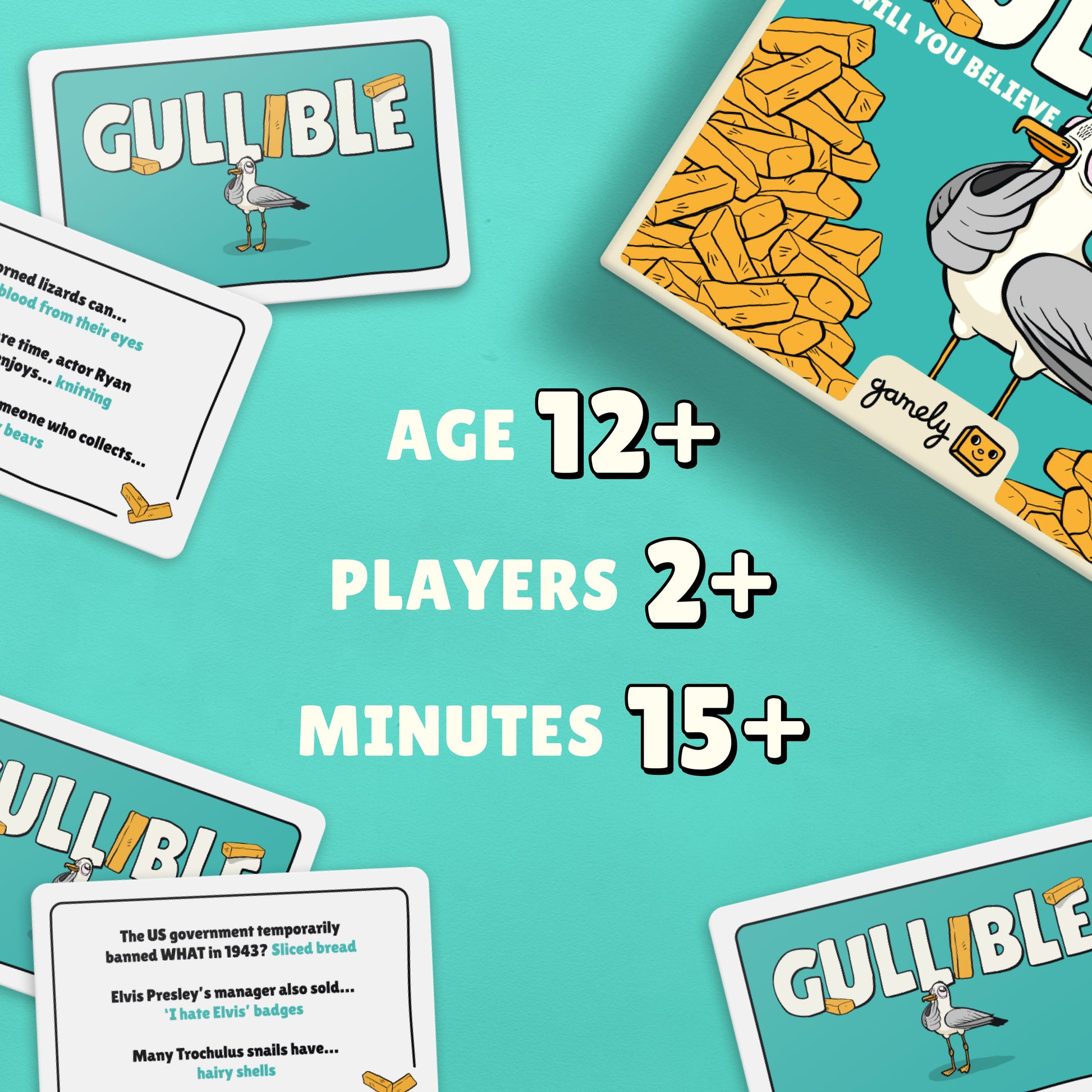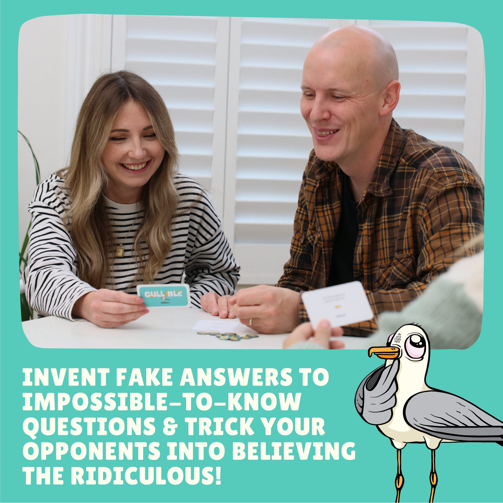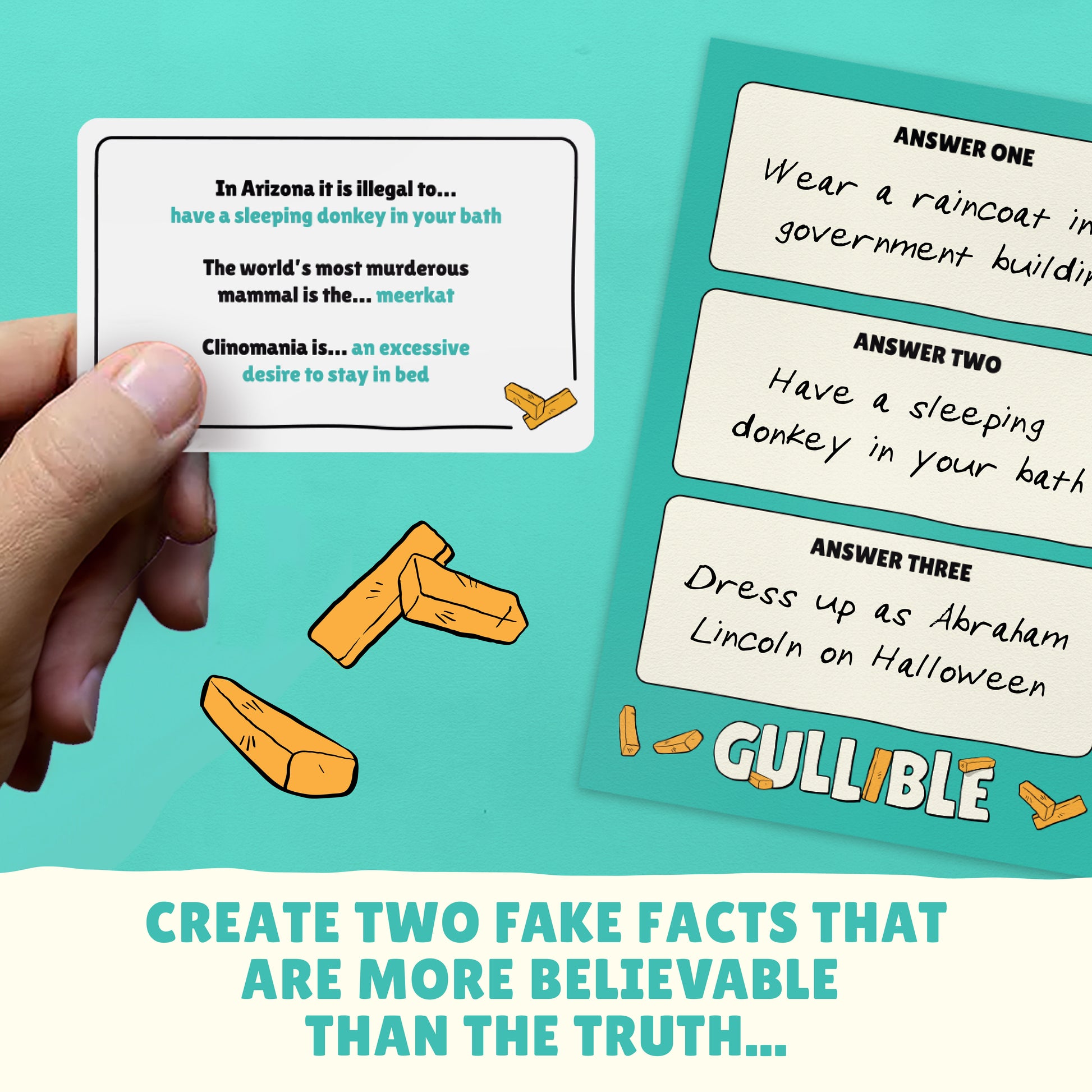 Using your smarts, random knowledge and bluffing will you be able to fool the other team into believing the unbelievable? Gullible is a party game where you create fake answers to impossible to know questions and see if you can trick your opponents into believing the ridiculous.