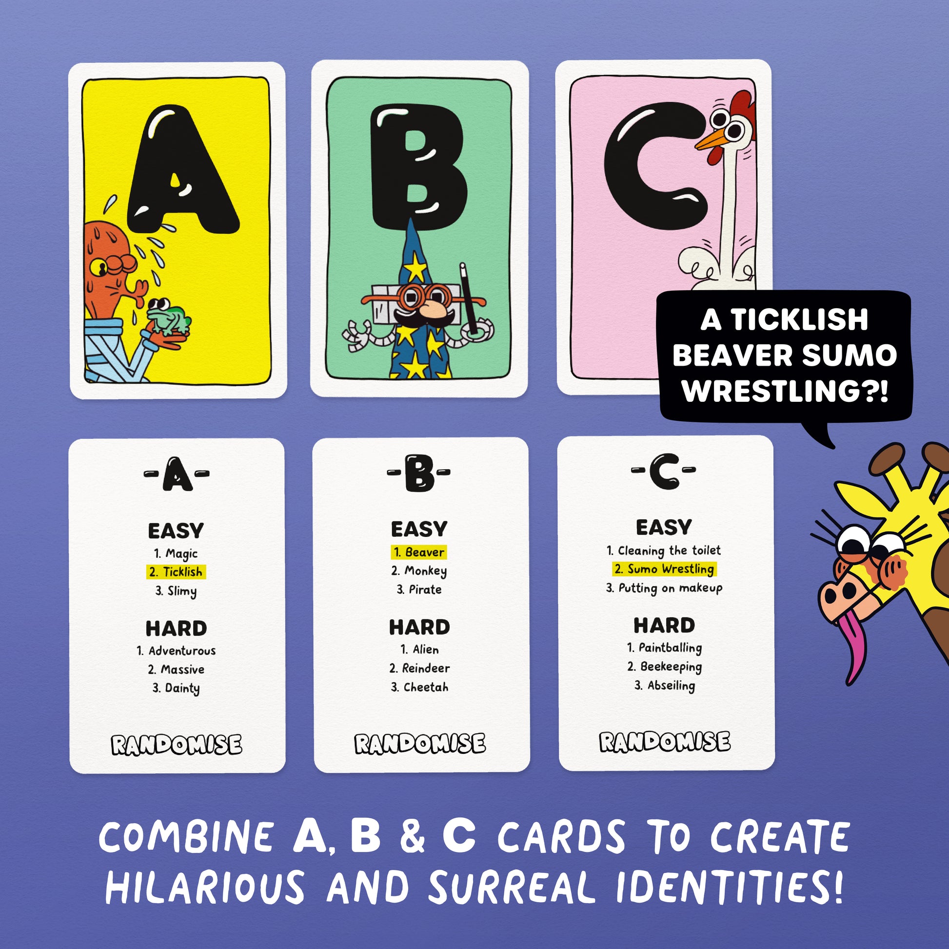 With more than a million brilliantly funny card combinations, randomise is the game that will put a smile on everyone’s face. Can your friend describe a confused dinosaur selling lemonade or can grandma act out a clumsy beaver hula hooping?